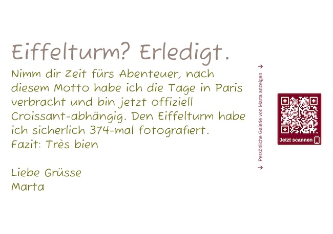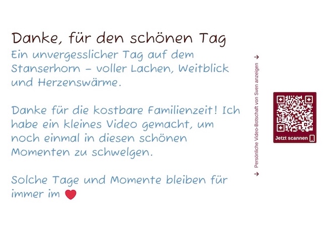 Unsere Premium-Papierkarte, diskret verschickt in einem Briefumschlag, macht deine Nachricht lebendig: Ein QR-Code führt die Empfängerin oder den Empfänger zu deiner persönlichen Video-Botschaft, Sprachnachricht oder Bildergalerie.